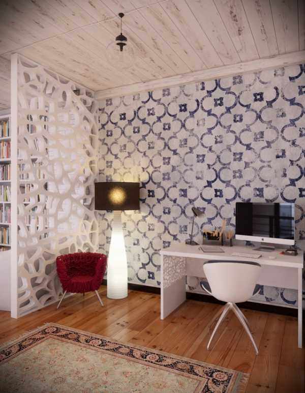 Разделение зоны отдыха и рабочего стола с помощью декора стены деревянными рейками и дощечками