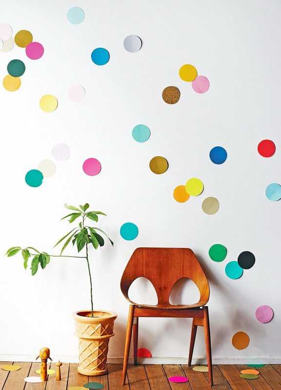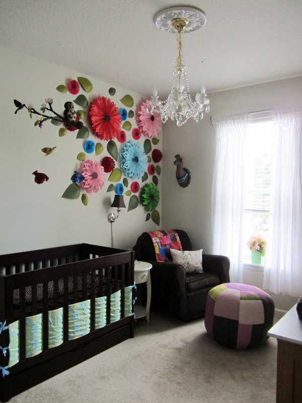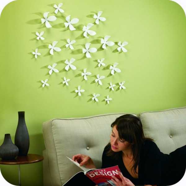 Наиболее оригинальный декор стены своими руками можно выполнить с использованием бумажных аппликаций. Это могут быть как смелые бумажные цветы, так и любые другие фигуры.