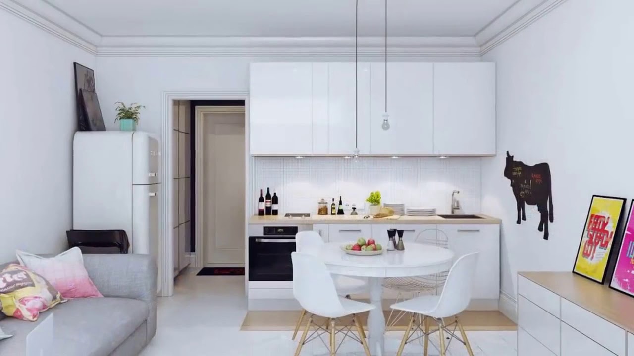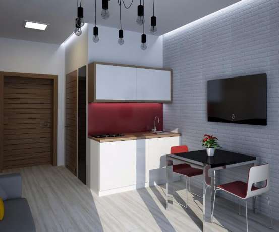 Чтобы это крошечное пространство включало в себя необходимые функции, такие как гостиная, спальная зона, кухня и ванная комната; дизайнеры блестяще использовали каждый сантиметр. Пространство студии полностью открыто, что создает одну красивую комнату, в которой размещены все предыдущие функции. Во-первых, дизайнеры идеально использовали поверхность стен, чтобы создать множество шкафов для хранения вещей в минималистском дизайне и отделке из дуба, которые придают помещению стильный современный вид.Во-вторых, они создали два уровня на полу, чтобы освободить больше места. Далее следует роль многофункциональной и съемной мебели; например, кровать и диван — это одно и то же: диван на самом деле представляет собой кровать, половина которой входит в углубление под более высоким уровнем пола, образуя удобный диван, который превращает гостиную и спальню в то же место. Даже журнальный столик в минималистском стиле, который дополняет диван, когда его используют в качестве гостиной, имеет место под навесными шкафами, поэтому его можно спрятать, когда придет время превратить диван в кровать.