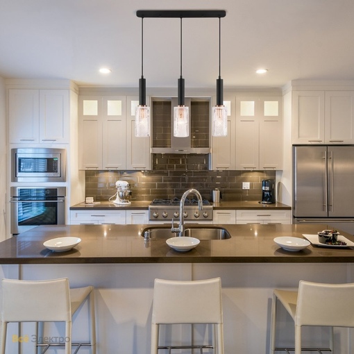 Все светильники, используемые на кухне, должны быть либо из одной коллекции, либо же гармонично сочетающимися. Важно, чтобы хорошо смотрелись и стиль, и форма, и цвет, и даже материал.