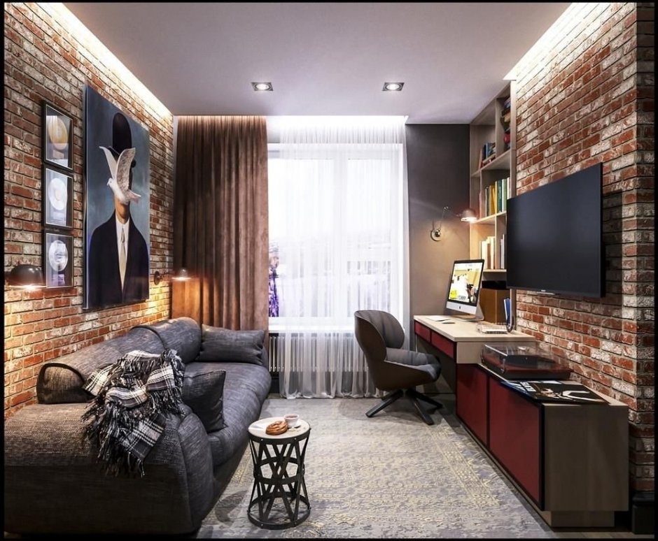 А вот делать «кирпичными» боковые стороны не рекомендуется. Это ещё более усилит неравномерную освещённость такого помещения, дальняя от окна сторона будет казаться ещё более тёмной. Если не хочется выкладывать клинкером всю стену, можно выложить область перемычки над окном, боковые поверхности в стороны от откосов, область под подоконником. Балочный тёмный потолок, кессонный потолок — тоже не совсем практичное решение. Он станет визуально скрадывать размер в ширину. Наоборот, высокий, светлый потолок, «махровый», выполненный фасадным валиком с грубой шубкой и матовой краской визуально увеличит высоту.
