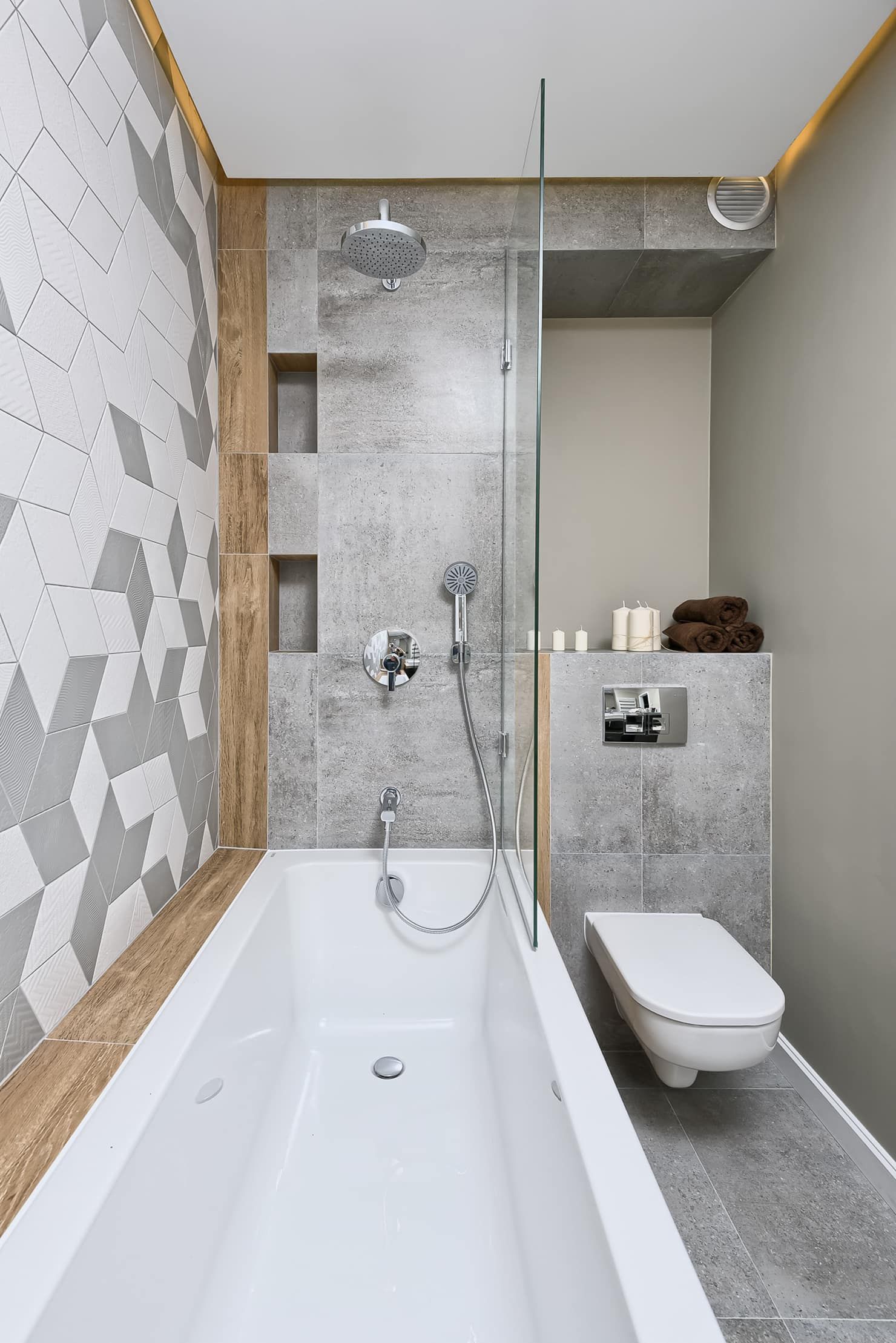 С практичной точки зрения кабинка выигрывает, но тем, кто любит нежиться в расслабляющей пене, необязательно жертвовать комфортом. Дизайнеры советуют отказаться от округлых и уголовных ванн, если помещение длинное и узкое. Модели, близкие по форме к прямоугольнику или асимметричные варианты, – лучшее решение. Еще лучше, если они будут иметь прозрачные вставки.