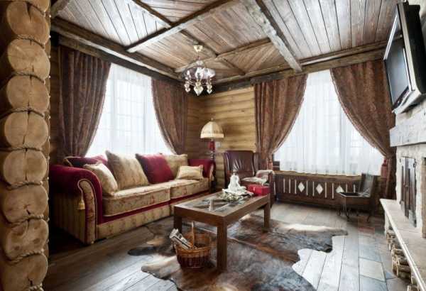 Отделка и подавляющая часть предметов интерьера выполнена из дерева. Для обшивки стен используют как деревянные панели, так и цельные бревна. Русский деревенский стиль незамысловат, но не лишен привлекательности.
