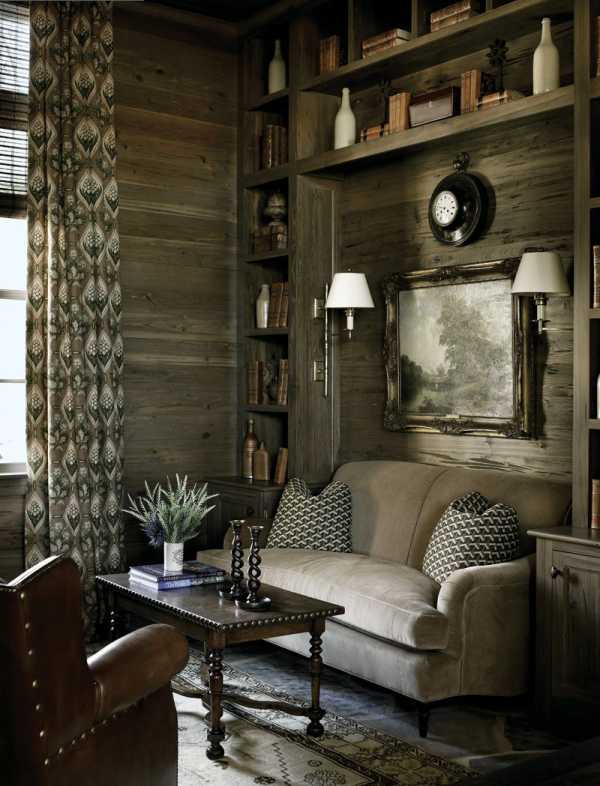 Камин — обязательный предмет интерьера. Напротив камина располагается уютный диван или массивное кресло. У стульев и кресел есть отличительная особенность — высокая спинка. Это удобно и располагает к долгим беседам.