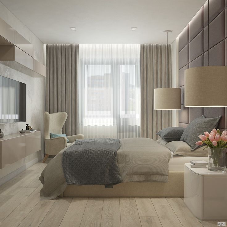 Дизайн спальни выполнен в светлых тонах