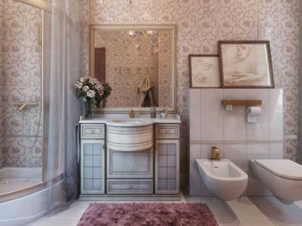 Ванная в классическом стиле совмещенная с туалетом — это продуманный дизайн, элегантно оформленное помещение со светлыми стенами, обставленное со вкусом, с эргономично расставленной мебелью и сантехникой. Если размеры позволяют, то в классическую ванную нужно обязательно определить «купель» на изящных металлических ножках. Несмотря на давний спор дизайнеров, уместны ли душевые в ванных под классику, их используют, но только легкие конструкции из прозрачного стекла. Душевое оборудование, также как и ручки на шкафчике с врезанной в него раковиной, нужно подбирать под бронзу или медь.