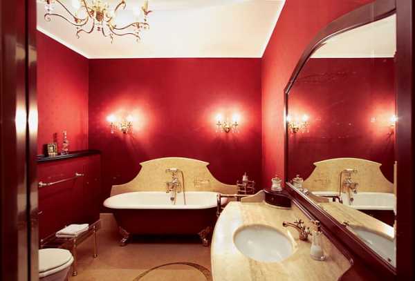 Ванная в стиле «ампир»Маленькому помещению требуется добавлять объем любыми способами и сценарий освещения может способствовать в решении этой задачи. Яркий верхний плафон вкупе с глянцевыми поверхностями и зеркалом отлично справится с задачей визуального расширения пространства. Еще одним приемом для придания комнате большего размера является размещение точечного освещения по периметру потолка ванной. С таким размещение света потолок становится выше и в помещении добавляется воздух. К тому систему включения света можно задать разными сценариями.