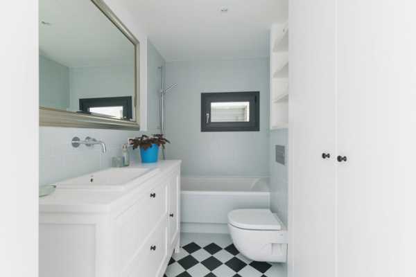 Отказавшись от громоздкой сантехники в пользу кабины для душа, можно выиграть в площади. Если же такой выбор неприемлем для вас, установите угловую ванну. Отличное решение – закреплённая прямо на стене раковина, под которой может расположиться корзина для белья.