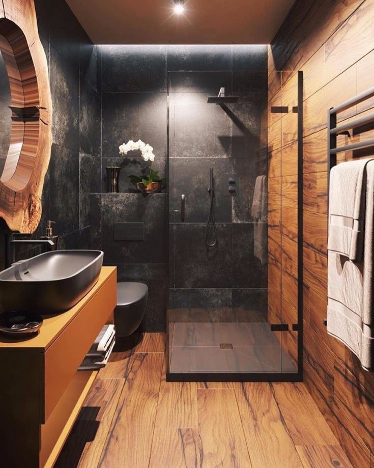 Ванная комната в коричневом цвете выглядит также очень уютной. Керамогранит под дерево в коричневых тонах будет приятно смотреться и на полу, и на стенах. Текстуры дерева в ванной наполнят интерьер природной гармонией. При использовании темных тонов коричневого или любого другого цвета нужно позаботиться о достаточно ярком освещении. Это же касается и интерьеров с преобладанием черного цвета.