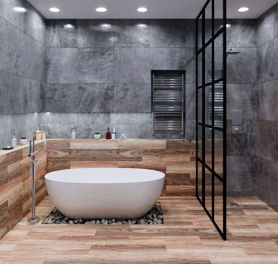 Для пола ванной рекомендуется использовать матовое покрытие глазури керамогранита. Это может быть поверхность бетона, моноколора, натурального камня. Также хорошая идея – сделать выбор в пользу керамического гранита со структурой дерева. С виду такое покрытие неотличимо от деревянной поверхности и имеет такое же покрытие с рельефом. Керамогранит такого типа меньше скользит при попадании влаги.
