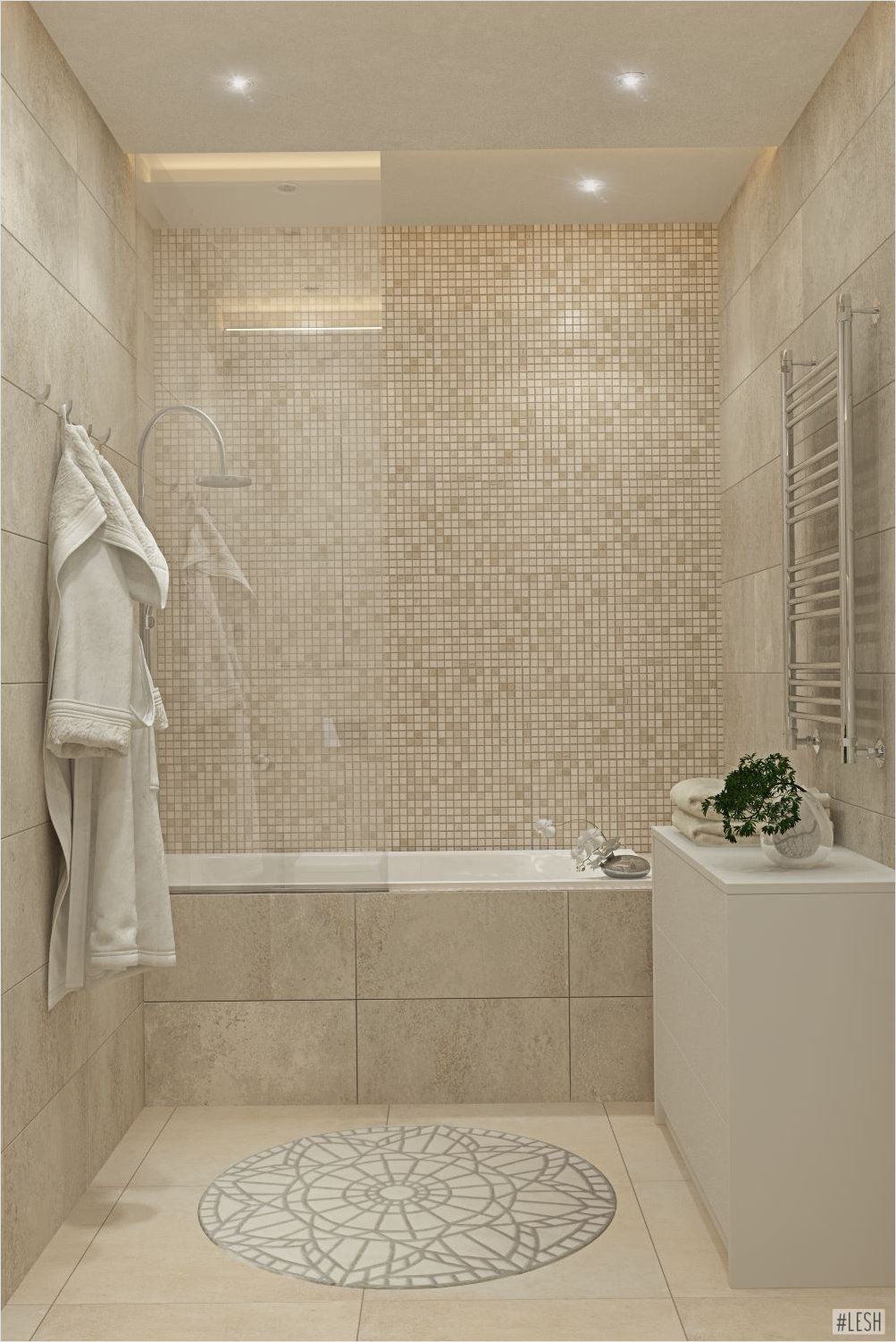 Атмосферу востока поможет сделать светло-бежевая мозаика на бежевом фоне. Остается добавить пену для ванной и аромосвечи и вы окажетесь в чудесном, уютном спа-салоне.