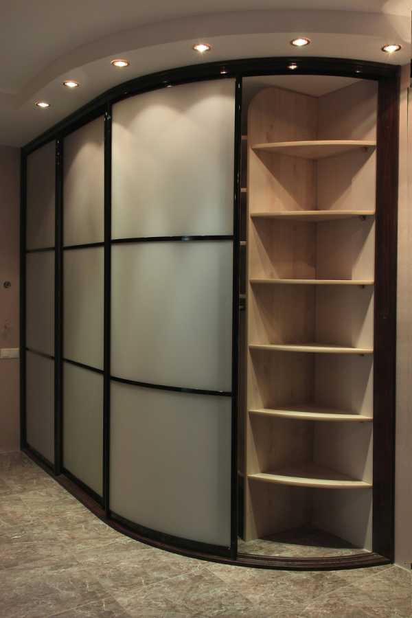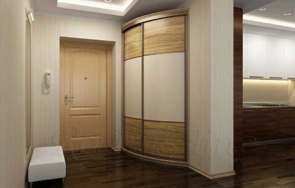 Угловой гардероб компактнее, он достаточно вместителен, а скруглённые углы визуально делают конструкцию изящнее. Радиусный встроенный шкаф является вариацией углового, но створки имеют выпуклую форму. По размерам такая конструкция может быть весьма компактной, около полуметра, или шире в зависимости от габаритов прихожей. Однако из-за сложности механизма створок и их формы такие шкафы самые дорогие.