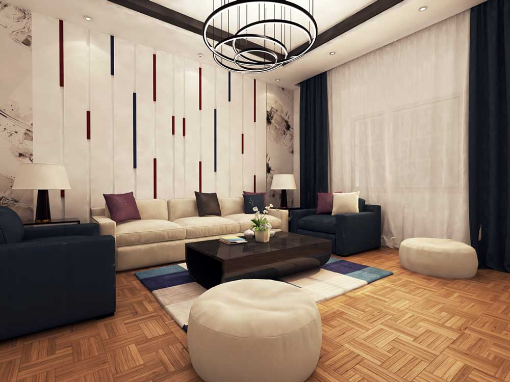 Также существуют виды интерьера, в которых гостиная совмещена с библиотекой, балконом и прихожей. В этом случае для зонирования применяют другое напольное покрытие или тот же отделочный материал, но другой фактуры и цвета.