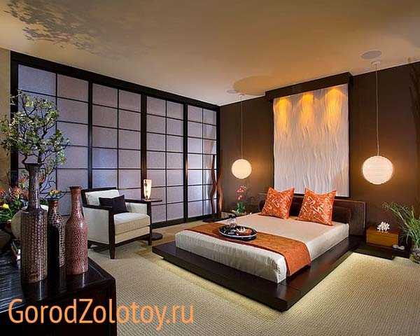 Восточный стиль — используются различные национальные культуры стран Востока (Китай, Япония, Марокко, Индия и др.). Спальня в восточном стиле, представленная на фото в интернете, может оформляться как с использованием национальных элементов одной страны, так и общевосточных принципов. Допускается использовать восточные ковры, бахрому, оригинальные орнаменты, множество разноцветных подушек, различные национальные элементы в декоре (вазы, статуэтки, светильники).