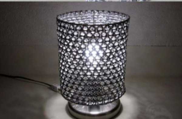 Для изготовления такого оригинального осветительного прибора мастеру понадобится пустая пятилитровая пластиковая ёмкость, основа под настольную лампу с подставкой и куча одноразовых ложек. У ёмкости отрезается дно или в нём вырезается круглое отверстие. Её следует закрепить на основе светильника верхней частью – горлышком. На поверхность «баклажки» наклеивают ложки с отрезанными ручками выпуклой частью наверх в шахматном порядке.
