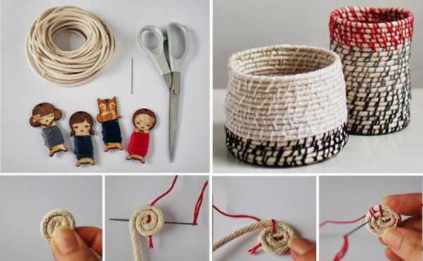 Даже простую верёвку, которую хозяйки используют для сушки белья, можно использовать в таком занятии, как рукоделие своими руками для дома. Мастер-классы помогут научиться создавать коробочки, корзиночки, баночки, кашпо путем укладывания и скрепления жгута.