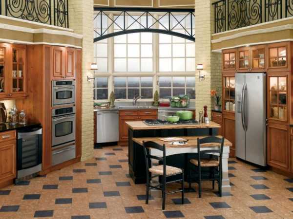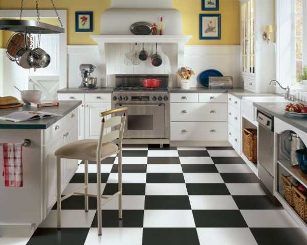 Для кухни желательно выбирать виды с шероховатой поверхностью, чтобы не было травм. Но естественно такой линолеум будет тяжелее мыть. Кухня с темным полом, покрытая таким напольным покрытием, едва ли может претендовать на какой-то уникальный дизайн. Это напольное покрытие при всем многообразии расцветок, предлагаемых производителями, как правило, выглядит обыденно и слишком по бытовому.