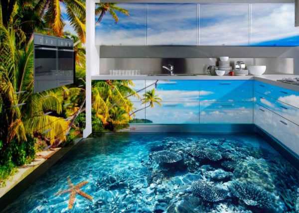 Помимо буквально любого оттенка любого цвета, эта технология позволяет создавать на полу настоящие шедевры. Дизайнеры, работающие с таким видом напольных покрытий, могут предложить совершенно любой орнамент и рисунок. Интерьер кухни пол – на нем можно создавать даже 3д картины. Кухня с таким полом никогда не будет выглядеть обыденно. Технология наливного пола позволяет превратить кухню в уголок сказочного фантастического мира. Вы сами выбираете, какой она будет — кухня с темным полом или светлая кухня.