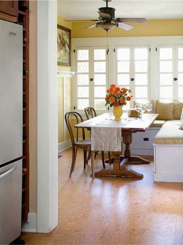 Пробковый пол. Это еще один новый вид полового покрытия, который может успешно применяться на кухне. Пол в кухне фото, покрытый таким материалом, довольно теплый, практически не вызывает аллергию. Имеет хорошую влагоустойчивость. Пробка не горит, что может быть важно для кухни. На таком покрытии не образуется плесень и грибок. Пробка — высоко экологичный материал, не содержащий токсинов.