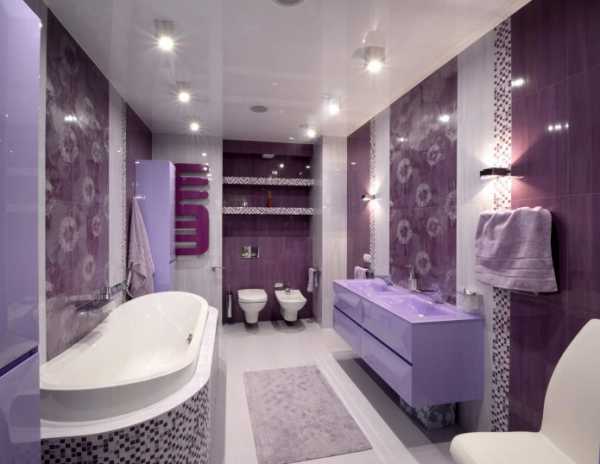 Фиолетовая ванная очень требовательна по отношению к цветовому оттенку. Если речь будет идти о насыщенном цвете, в комнате нужно будет повесить зеркала и сделать хорошее освещение. Такие приемы расширят пространство. Визуального расширения комнаты можно добиться за счет белого потолка и светлого пола.