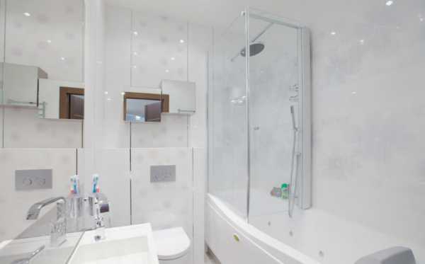 Ванная комната, оформленная в белом цвете, получается очень светлой и визуально большой. Использование светодиодного освещения и потолочных светильников помогает существенно улучшить это впечатление.
