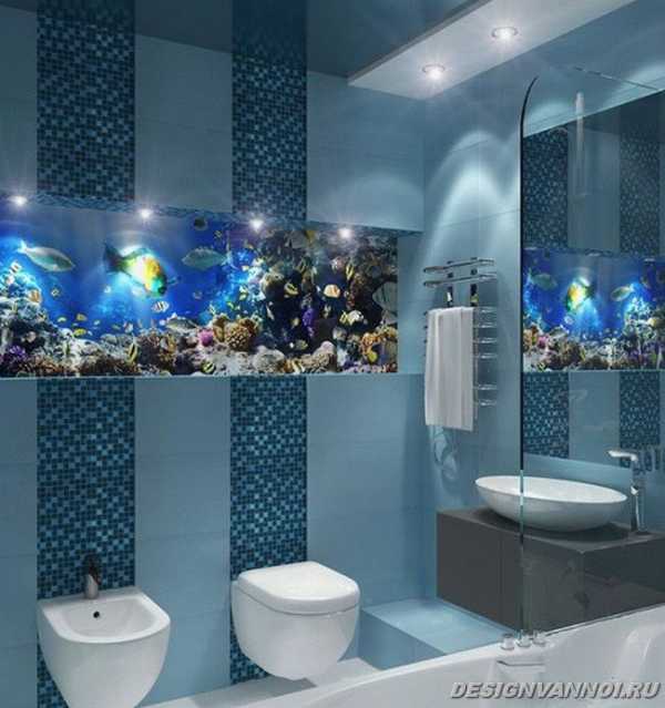 Морской стиль остается одним из популярных для ванной. Направлен на создание свежей и расслабляющей атмосферы. Палитра в белых и голубых тонах. На стенах размещают изображения морских обитателей. Можно дополнить пространство желтым оттенком, олицетворяющим песок. Зеркало определенного дизайна в виде иллюминатора судна.