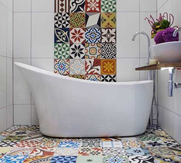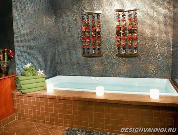 Если хочется добавить экстравагантности следует воплотить восточный стиль. Используется теплая, насыщенная гамма. Плитка только маленького размера, лучше мозаика с комбинацией различных тонов. Можно заменить стандартной плиткой, украшенной орнаментом на восточный мотив.