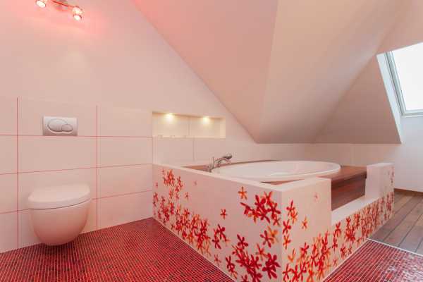 Красно-белая плитка в ванной — это, безусловно, экстраординарное оформление ванной для людей, которые испытывают недостаток в энергии и хотят сразу проснуться по утрам. Красный цвет является возбуждающим и активизирует энергетические процессы в организме.