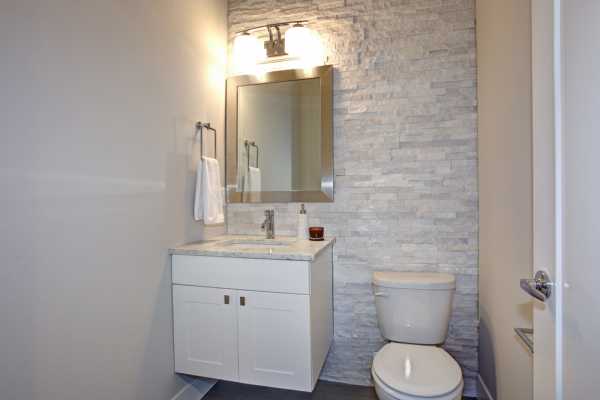 « Mark Breck ANDRII/Shutterstock.com»В отдельных случаях в маленьких ванных может быть установлена небольшая светодиодная люстра, но обычно ее заменяют потолочными точечными светильниками для создания верхнего освещения.