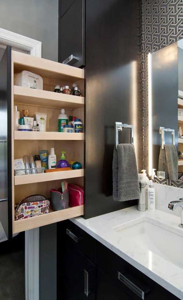 « Arsel Ozgurdal/Shutterstock.com»Хорошей идеей для небольших ванн считается плоский шкаф-полку глубиной 15-20 см с большим зеркалом в качестве передней панели-дверки. Большое зеркало может быть размещено на передней части пенала для хозяйственных принадлежностей, стиральной машины и корзины для белья.