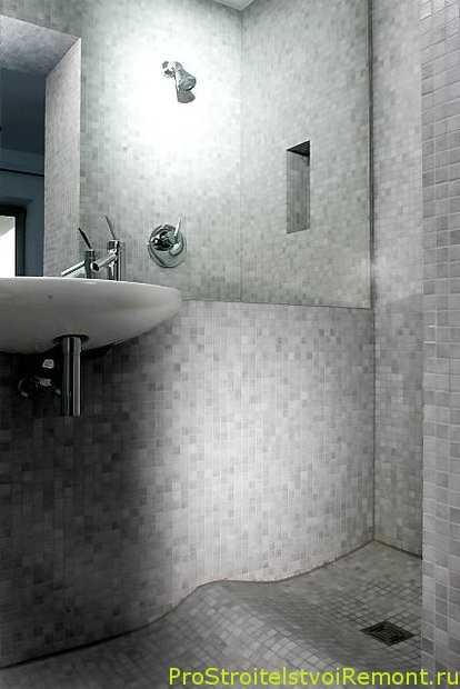 При сооружении такого пространства для принятия водных процедур, можно экспериментировать с полом. Очень часто дизайнеры выкладывают плитку необычным узором, или используют мозаику.