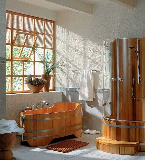 Именно поэтому к традиционному оформлению этого помещения можно отнести использование камня, дерева и зелени.
