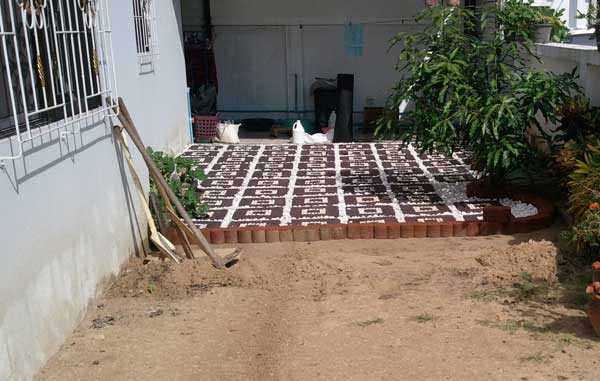 Вне зависимости от выбранного вами основного материала, дно ямы нужно уплотнить гравием и песком. Затем нужно сделать форму для бетона с наполнителем или бортики для блоков. В качестве декоративных ограждений могут выступать небольшие бревенчатые колья, а также пластиковые и стеклянные бутылки, которые закапываются вверх дном.