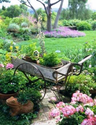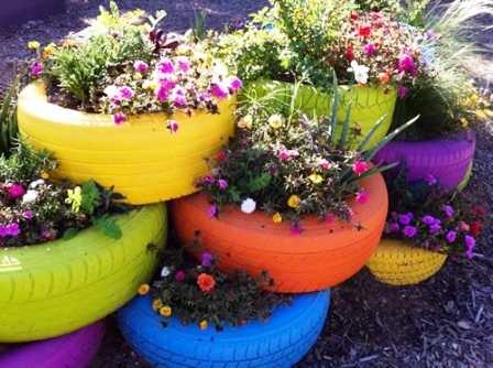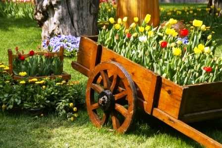 Что же понадобится для создания удивительной красоты? В ход могут пойти старые покрышки, цветочные горшки, коробки, вазы, тележки, старая лодка, булыжники и камни различного размера, тачанки, ведерка и это не полный список всего разнообразия.