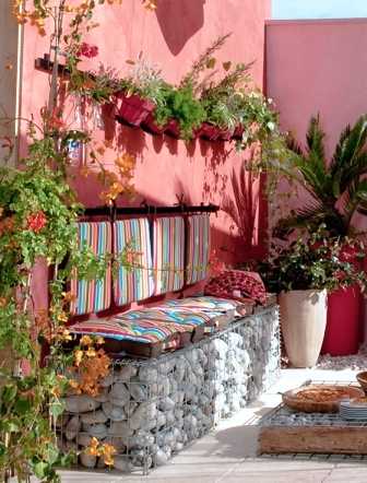 - Средиземноморский стиль. Главный элемент сада — патио, обязательно с плетеной мебелью, уместны кованые элементы, простой текстиль, всевозможные горшки, кашпо и этажерки с цветами, глиняная посуда. Обязательно должна присутствовать беседка, увитая плющом, к которой ведет вымощенная крупным камнем дорожка. Уместны всевозможные элементы в античном стиле: колонны, статуи, фонтаны. Яркие клумбы придадут настроение.