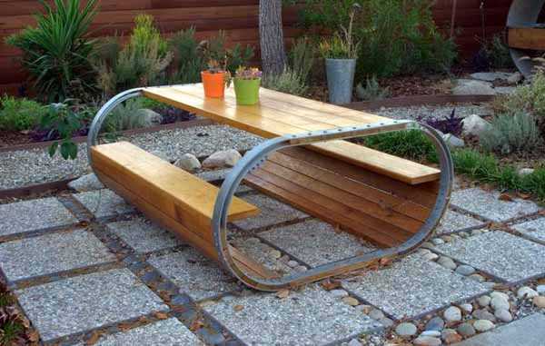 - Скамейки — функциональный декоративный элемент, который должен соответствовать единому стилю участка.