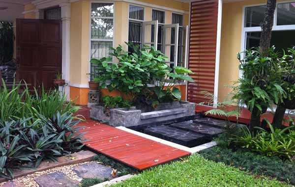 К небольшому водоему, размещенному около веранды, ведет красивая садовая дорожка с натуральным камнем и галькой, которая переходит в очаровательный маленький мостик из камней. Шум маленького водопада позволяет получить не только зрительное удовольствие, но и полностью расслабиться после трудовых будней. Используя красивые декоративные травы, подсветку и тематические садовые фигурки, вы придадите этой площадке около дома действительно роскошный вид.