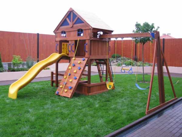 - Детская площадка или место для активного отдыха. Это может быть деревянный настил с установленным оборудованием: качелями, батутом, бассейном.