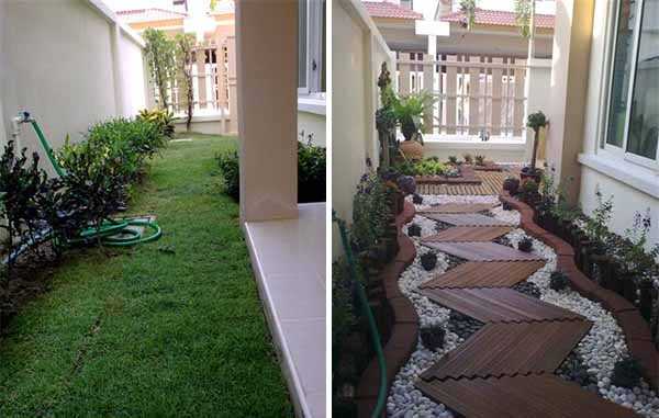 Так, узкая длинная дорожка между стеной дома и забором не представляла собой ничего особенного. Для таких малоиспользуемых участков можно сделать декоративную гравийную дорожку. Как и под любую дорожку, нужно выровнять основание и положить песчаную подушку, добавить, если надо, растения по краю дорожки.