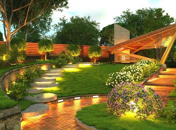 Все, что мы видим – это свет и его восприятие нашим мозгом. Играя освещением, можно создавать самые интересные эффекты и добиваться визуального увеличения территории, за счет выделения самых важных зон.