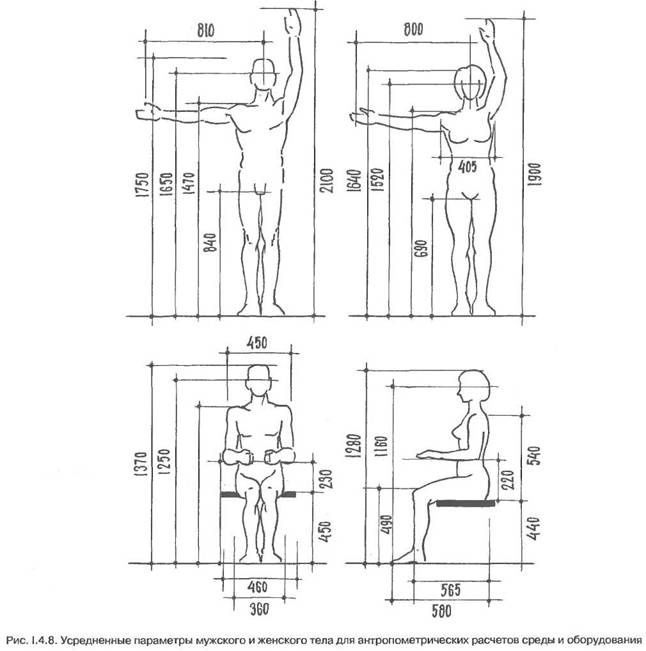 В ряде областей сегодня уже сложились определенные эргономические требования и нормативы. Так, мы знаем из мебельного конструирования, что высота рабочей плоскости письменного стола — 750 мм, сидения стула или табурета — 450 мм., кресла для отдыха — 350 мм., и т.д. И несмотря на смены художественных стилей и направлений, несущих с собой свои особенные формы и детали, материалы и конструкции, эти параметры, исходящие из физических размеров человека, остаются практически неизменными уже на протяжении длительного времени.