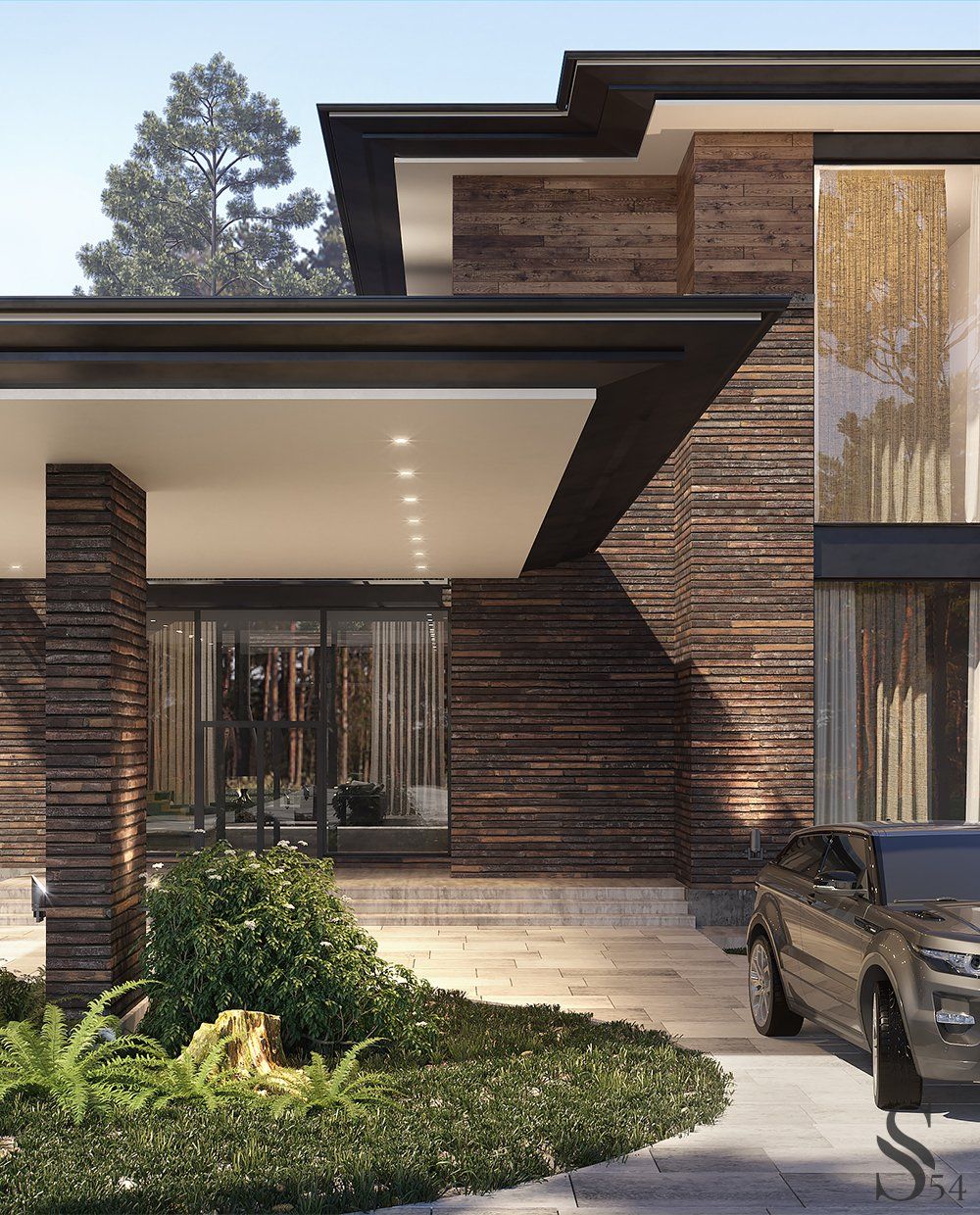 Все фото На фото: V-образный современный дом в хвойном лесу