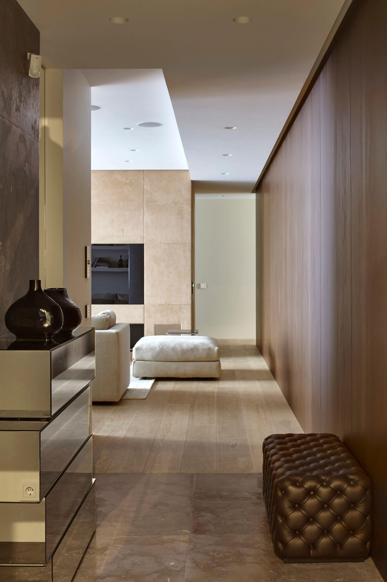 Консоль изготовлена по эскизам автора проекта. Настольная лампа Visual Comfort. Используя зеркальные полотна в качестве отделки, авторы проекта добились эффектной игры отражений. Используя зеркальные полотна в качестве отделки, авторы проекта добились эффектной игры отражений. Консоль индивидуального изготовления, лампа Visual Comfort.На виду в квартире находится минимум предметов, зато предусмотрено много скрытых систем и даже комнат для хранения. Например на кухне за деревянными панелями созданы и дополнительные шкафы, и кладовая для продуктов. Как и во всех наших проектах, мы применили централизованное управление инженерными системами: это удобно в пользовании и экономит электроэнергию.