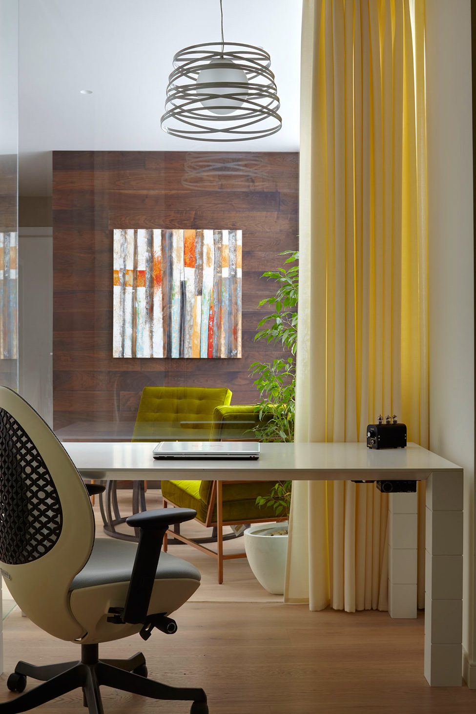 При входе посетителей встречает настенная галерея с черно-белыми фотографиями, дающими первый намек на то, что происходит за углом. (посмотрите, как одноместный гамак определил расслабляющую атмосферу современного интерьера.) Большая современная гостиная поражает своей элегантностью. Белые и бежевые шторы от пола до потолка поглощают свет, проникающий через большие окна, создавая таким образом одинаково распространенный дневной свет. Несмотря на то, что первое, что все замечают, — это роскошное черное пианино, центром комнаты определенно является синий стул, выделяющийся из черно-бежево-белого сочетания цветов.