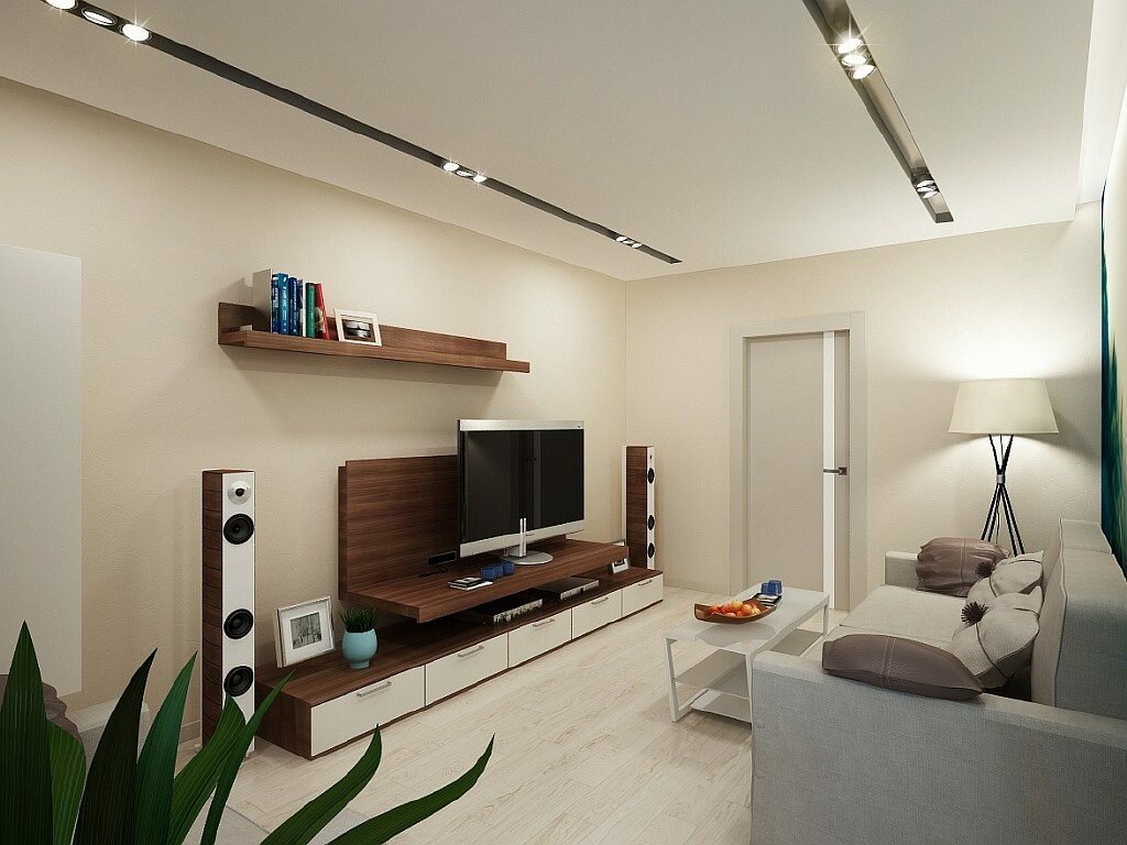Минимальное количество мебели, лаконичные формы и простые цвета – идеальный вариант дизайна для скромных габаритов гостиной. Для молодых людей нет более выгодного оформления. Допускается бюджетная отделка в светлых тонах, важно отсутствие дополнительного декора.