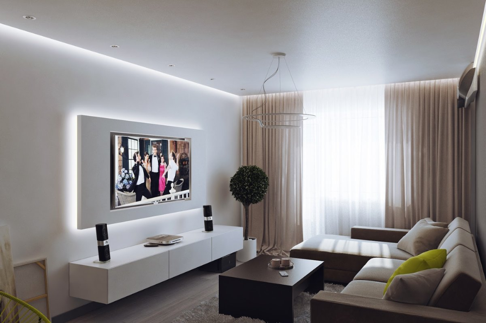Если территория не позволяет иметь отдельно место для приема гостей и зону отдыха, на стене напротив мягкой мебели удачно разместиться телевизор. Соответственно, одна и та же часть комнаты может носить разный характер, в разное время.