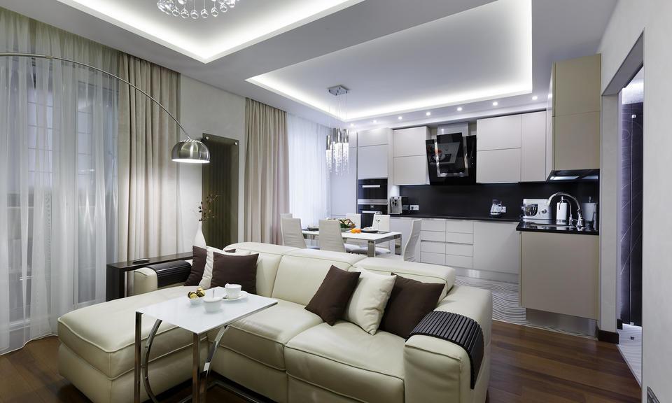 В типичных многоэтажных домах не всегда есть возможность оборудовать отдельную полноценную гостиную. В таком случае, дизайнеры прибегают к методу объединения нескольких комнат в одну площадь, допустим гостиной с кухней или спальней.