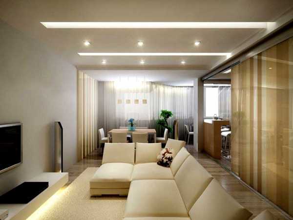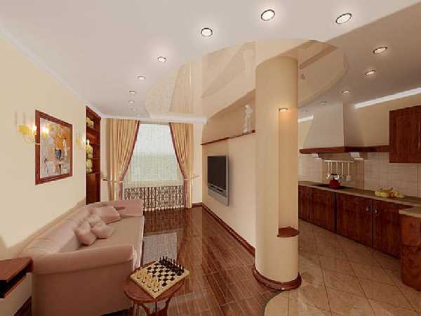 Начнем с выделения зон гостиной и кухни. Чаще всего зонирование выполняется с помощью дизайна потолка, пола. Это может быть отличие покрытия и цвета зон, разные уровни потолка, пола.