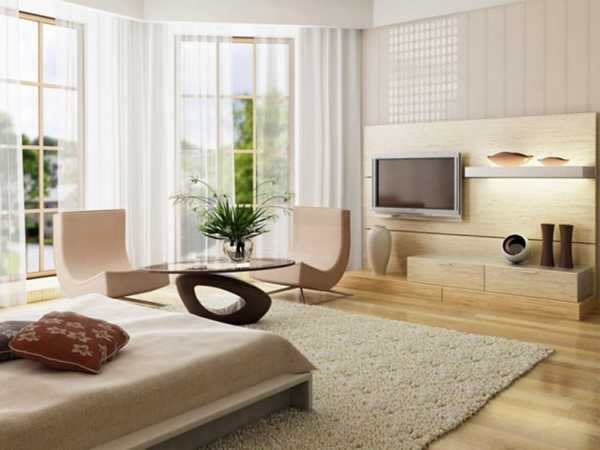 Что касается стиля, то лучше всего однокомнатную квартиру отделать в стиле минимализма. Только этот стиль поможет вам решить все вопросы по ее дизайну. Телевизор, повешенный на стену, также освободит некоторое пространство, которое было занято столиком для него. Место кровати только в центре квартиры, изголовьем у стены. Остальная мебель распределяется по углам.