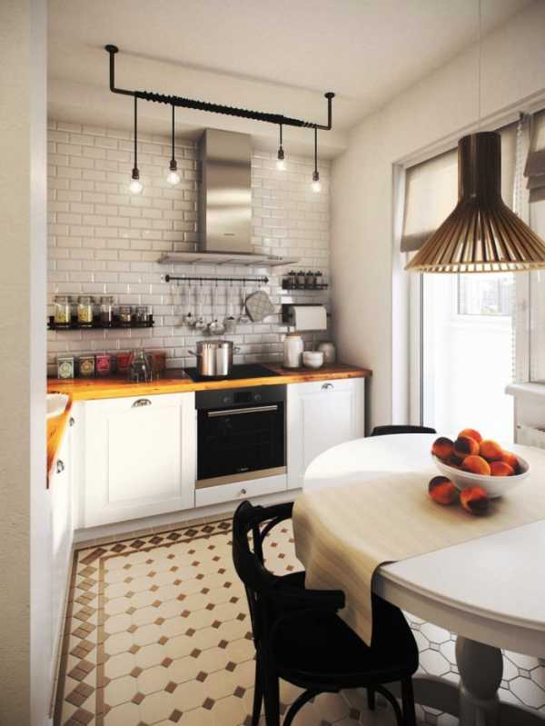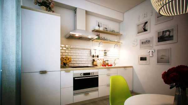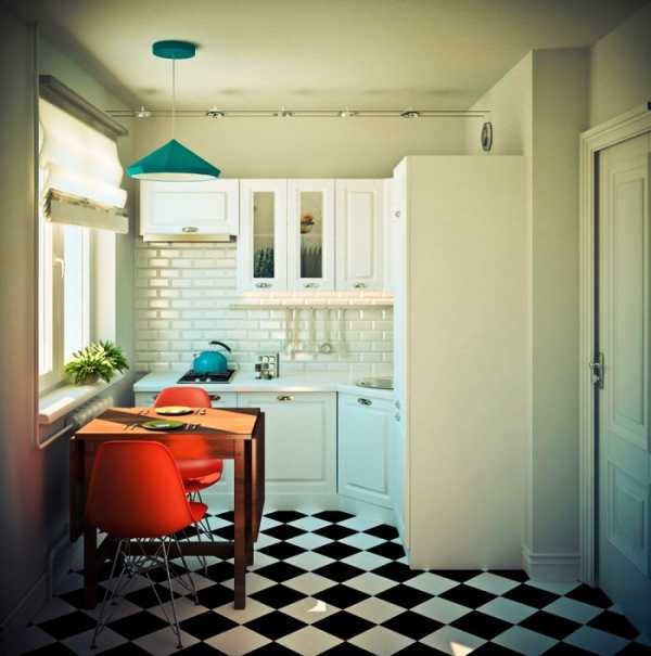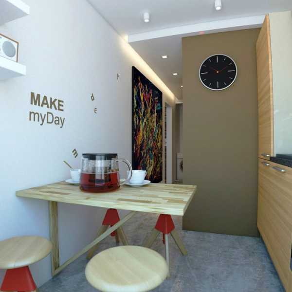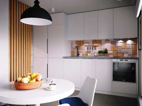 Основной цвет в дизайне маленькой кухни – белый, что делает ее визуально просторнее. Обеденный стол складывается в целях экономии места. Его столешница из натурального дерева смягчает строгую стилистику отделки и делает кухню уютнее.